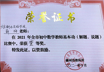 在剛落下帷幕的2021年贛州市初中數學青年教師基本功暨“解題·說題”比賽中,我校薛梅老師榮獲全市...